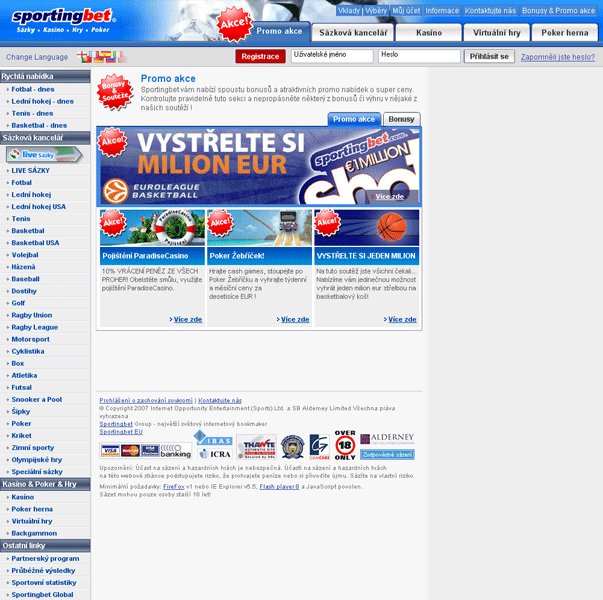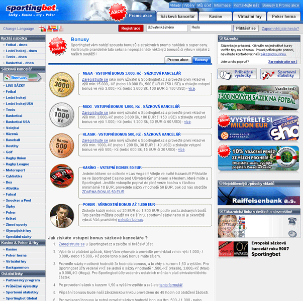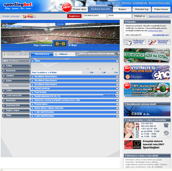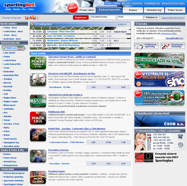 Sportingbet.cz je sázková kancelář, která již od roku 1998, kdy byla založena, se stala jednou z nejoblíbenějších sázkových kanceláří na internetu. Sportingbet svým hráčům nabízí služby kurzového sázení, tipování a online kasina. Sportingbet poskytuje svým hráčům kompletní podporou v českém a slovenském jazyce s profesionálním přístupem. Sportingbet klade velmi velký důraz na ochranu osobních údajů a bezpečnost jako ostatní sázkové kanceláře. Za hráčský účet vedený u Sportingbet nejsou účtovány žádné poplatky a vklady i výběry lze u Sportingbet provádět mnoha způsoby např. bankovním převodem, kreditními kartami Visa, Mastercard nebo internetové peněženky Moneybookers (doporučujeme). U Sportingbet můžete využít atraktivní nabídku vstupních bonusů, která je velmi obsáhlá, a potěší každého začínajícího hráče. Sportingbet nabízí velmi oblíbené Live sázky , kde můžete sázet až do poslední chvíle sportovní události. Sportingbet nezapomněl ani na podporu svých hráčů a poskytuje jim průběžné výsledky, sportovní statistiky a poměrně obsáhlé FAQ, kde se hráči dozví odpovědi na své otázky ohledně sázek a kurzového sázení u Sportingbet.