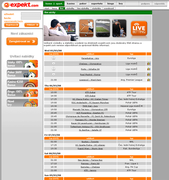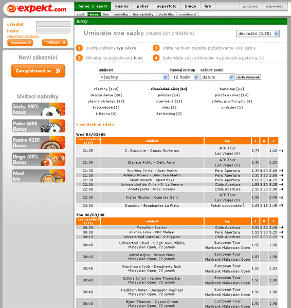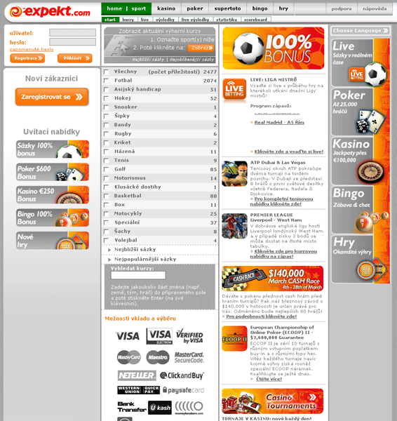 Expekt.com působí na trhu sázkových kanceláří od roku 1999, kdy byla založena, a v současné době má více než 1,5 milionu registrovaných uživatelů. O bezproblémový chod Expekt se stará více než 150 zaměstnanců, takže se jedná opravdu o velkou sázkovou kancelář, která nabízí kvalitní služby. Expekt jako ostatní sázkové kanceláře klade velký důraz na bezpečnost a ochranu osobních údajů. Vedení účtu u Expekt je zdarma a nejsou účtovány žádné další poplatky. Vklady a výběry můžete provádět mnoha způsoby. Podporovány jsou kreditní karty Visa a Mastercard, bankovní převod, internetové peněženky Moneybookers a Neteller. Profesionální podpora u Expekt je zákazníkům k dispozici nepřetržitě a je kompletně v českém jazyce. Expekt připravila pro své nové hráče pěkné vstupní bonusy, které všichni hráči rádi využijí. U Expekt nechybí ani podrobná nápověda a kompletní pravidla sázek. Expekt nabízí svým hráčům přitažlivé Live sázky, kde je možno sázet v průběhu sportovní události. Samozřejmostí u Expekt jsou průběžné sportovní výsledky, sportovní statistiky a LiveScore. To vše dělá z Expekt dobrou volbu, kde můžete začít sázet online právě Vy.