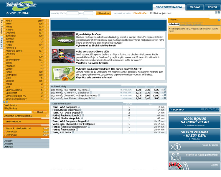 Bet-at-home.com je licencovanou sázkovou společností s pobočkami v Rakousku a na Maltě. V současné době má Bet-at-home více než 1,8 milionu registrovaných zákazníků. Bezpečnost je pro Bet-at-home hlavní prioritou. Profesionální zabezpečovací řešení zaručují maximální možnou ochranu. Bet-at-home nabízí sportovní i speciální sázení. Vybrat si můžete z široké nabídky sportovních událostí (fotbal, hokej, tenis, box, atd.) s výbornými kurzy. Bet-at-home má spolehlivý a rychlý zákaznický servis. Zákaznická podpora je u Bet-at-home kompletně v češtině. Sázky u Bet-at-home jsou vyhodnocovány okamžitě po skončení událostí. Za vedení účtu nejsou u Bet-at-home účtovány žádné poplatky. Převody lze na Bet-at-home provádět pomocí bankovních převodů, kreditních karet nebo internetové peněženky Moneybookers.